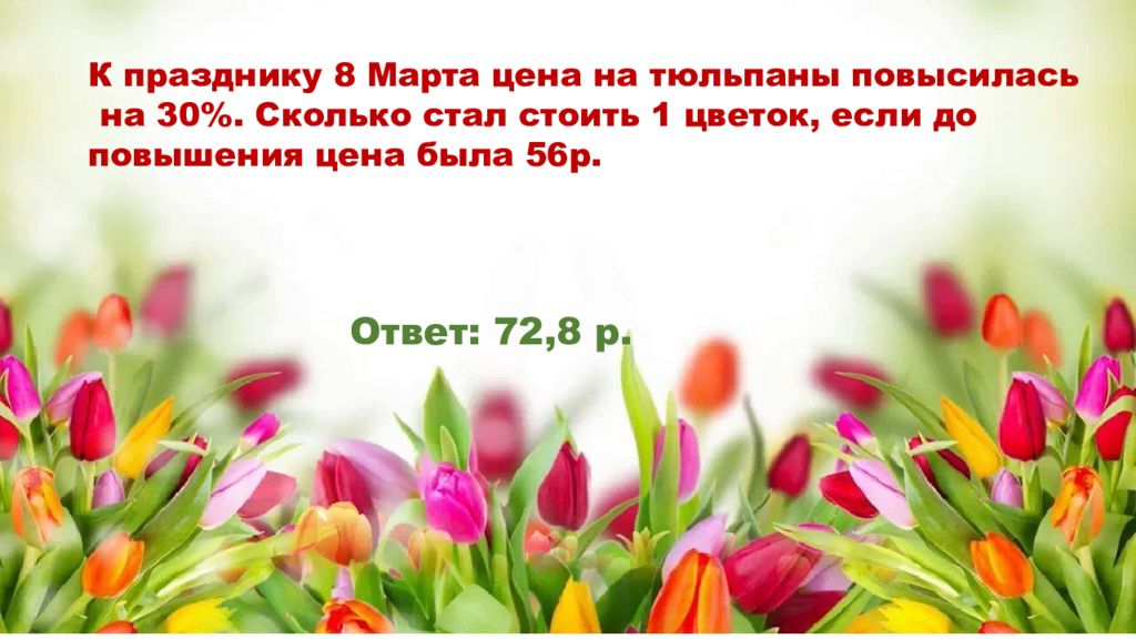 К празднику 8 Марта цена на тюльпаны повысилась на 30%. Сколько стал стоить 1 цветок, если до повышения цена была 56р. Ответ: 72,8 р.