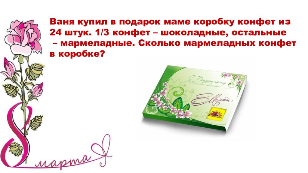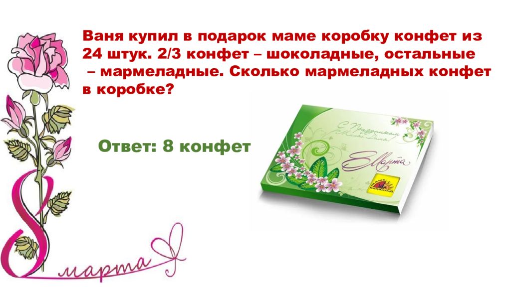 Ваня купил в подарок маме коробку конфет из 24 штук. 2/3 конфет – шоколадные, остальные – мармеладные. Сколько мармеладных конфет в коробке? Ответ: 8 конфет