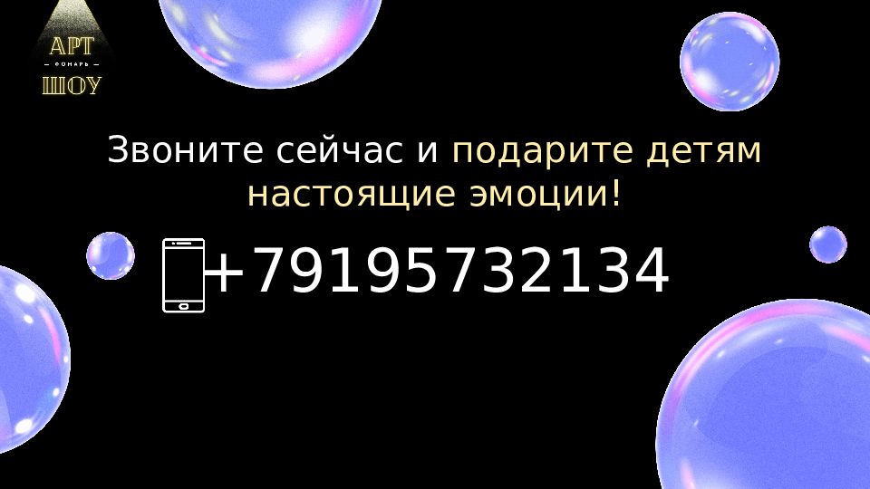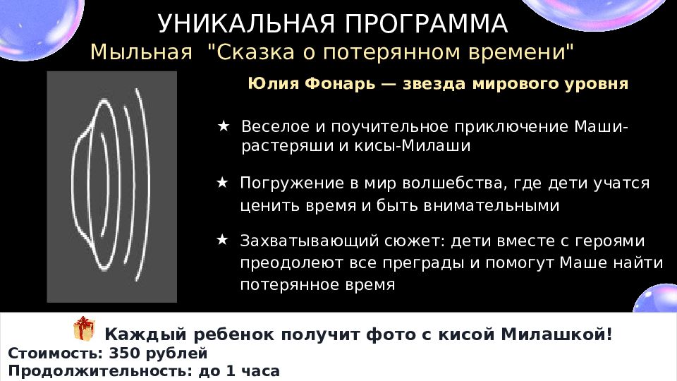 УНИКАЛЬНАЯ ПРОГРАММА Мыльная "Сказка о потерянном времени" Каждый ребенок получит фото с кисой Милашкой! Стоимость: 350 рублей Продолжительность: до 1 часа Юлия Фонарь — звезда мирового уровня Погружение в мир волшебства, где дети учатся ценить время и быть внимательными Захватывающий сюжет: дети вместе с героями преодолеют все преграды и помогут Маше найти потерянное время Веселое и поучительное приключение Маши-растеряши и кисы-Милаши