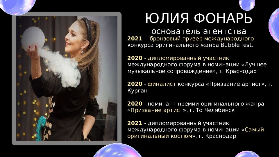 2021 - бронзовый призер международного конкурса оригинального жанра Bubble fest. 2020 - дипломированный участник международного форума в номинации «Лучшее музыкальное сопровождение», г. Краснодар 2020 - финалист конкурса «Призвание артист», г. Курган 2020 - номинант премии оригинального жанра « Призвание артист », г. То Челябинск 2021 - дипломированный участник международного форума в номинации « Самый оригинальный костюм », г. Краснодар ЮЛИЯ ФОНАРЬ основатель агентства