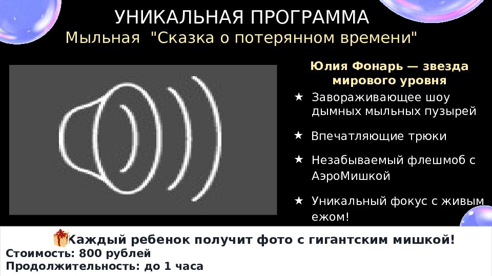 УНИКАЛЬНАЯ ПРОГРАММА Мыльная "Сказка о потерянном времени" Юлия Фонарь — звезда мирового уровня Каждый ребенок получит фото с гигантским мишкой! Стоимость: 800 рублей Продолжительность: до 1 часа Незабываемый флешмоб с АэроМишкой Впечатляющие трюки Уникальный фокус с живым ежом! Завораживающее шоу дымных мыльных пузырей