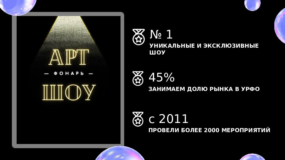 УНИКАЛЬНЫЕ И ЭКСКЛЮЗИВНЫЕ ШОУ № 1 ЗАНИМАЕМ ДОЛЮ РЫНКА В УРФО 45% ПРОВЕЛИ БОЛЕЕ 2000 МЕРОПРИЯТИЙ с 2011