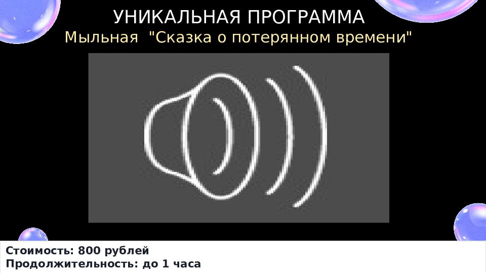 УНИКАЛЬНАЯ ПРОГРАММА Мыльная "Сказка о потерянном времени" Стоимость: 800 рублей Продолжительность: до 1 часа