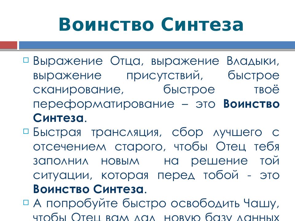 Воинство Синтеза Выражение Отца, выражение Владыки, выражение присутствий, быстрое сканирование, быстрое твоё переформатирование – это Воинство Синтеза. Быстрая трансляция, сбор лучшего с отсечением старого, чтобы Отец тебя заполнил новым на решение той ситуации, которая перед тобой - это Воинство Синтеза. А попробуйте быстро освободить Чашу, чтобы Отец вам дал новую базу данных для решения вашего вопроса. Это Воинство Синтеза. Отец ведь целен, он объявляет Волю всеобъемлюще. А мы как Воины Синтеза, есть его конкретные выразители в нужном месте, в нужный час. Попали, сумели выразить, вы – Воин Синтеза.