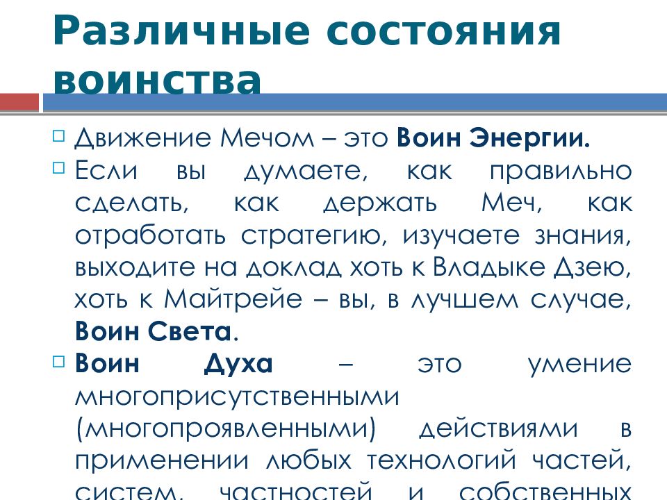 Различные состояния воинства Движение Мечом – это Воин Энергии. Если вы думаете, как правильно сделать, как держать Меч, как отработать стратегию, изучаете знания, выходите на доклад хоть к Владыке Дзею, хоть к Майтрейе – вы, в лучшем случае, Воин Света. Воин Духа – это умение многоприсутственными (многопроявленными) действиями в применении любых технологий частей, систем, частностей и собственных разных тел организовать и исполнить то, что ему одному поручено. То есть, умение в Воле Отца и Владыки исполнить нетрадиционно что-то. Воинство Синтеза – это управление вначале условиями, чтобы исполнить поручение. Собираешь условия, собираешь Огонь. Тебе должно хватать Синтеза. Не хватает – уметь выйти на контакт с Владыкой, с Отцом. И иметь Синтез, который тебя переформатирует в любой ситуации.