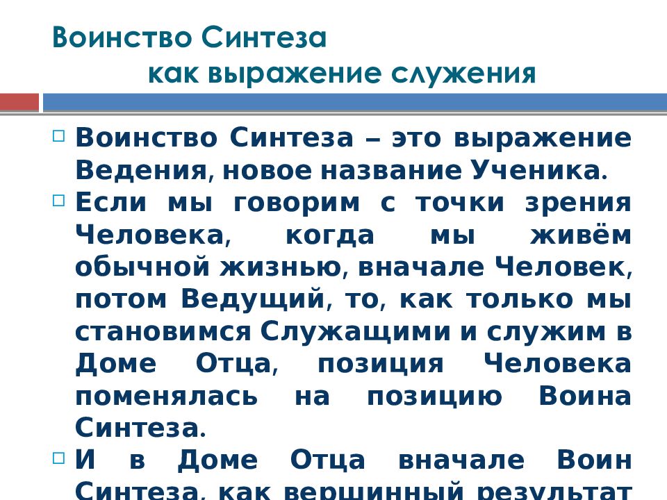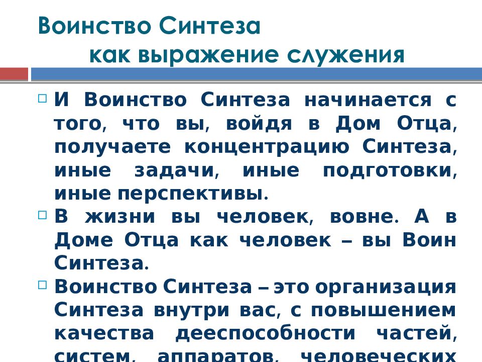 Воинство Синтеза как выражение служения Воинство Синтеза – это выражение Ведения, новое название Ученика. Если мы говорим с точки зрения Человека, когда мы живём обычной жизнью, вначале Человек, потом Ведущий, то, как только мы становимся Служащими и служим в Доме Отца, позиция Человека поменялась на позицию Воина Синтеза. И в Доме Отца вначале Воин Синтеза, как вершинный результат Человека, а потом Ведущий, потом Сотрудник. Воинство начинается с того, что входя в Дом Отца у вас развивается концентрация Синтеза. Воинство Синтеза – это ещё и концентрация Синтеза вами. Сложение Стандартов Синтеза, повышение концентрации Синтеза, Изначальности, выразимости каждого из вас и само понятие Во-инства – войти материей Синтеза. Тем Синтезом, который вы сложили, связали, скомпактифицировали.