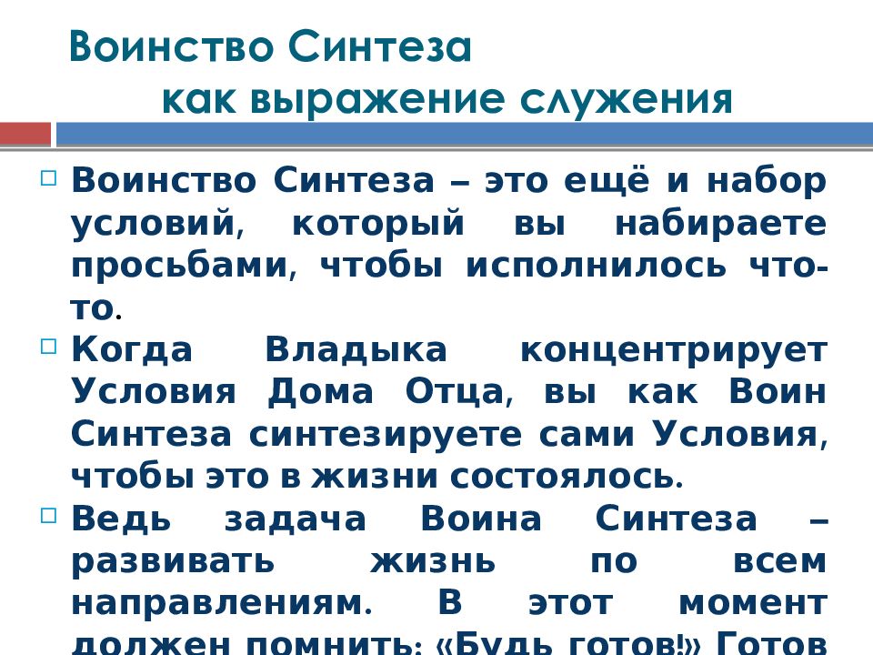 Воинство Синтеза как выражение служения Воинство Синтеза – это ещё и набор условий, который вы набираете просьбами, чтобы исполнилось что-то. Когда Владыка концентрирует Условия Дома Отца, вы как Воин Синтеза синтезируете сами Условия, чтобы это в жизни состоялось. Ведь задача Воина Синтеза – развивать жизнь по всем направлениям. В этот момент должен помнить: «Будь готов!» Готов к исполнению. И когда ситуация странная для тебя… идёт концентрация всего Синтеза, которым ты владеешь, чтобы выявилось твоё Воинство, как овладение, отстройка, преодоление и разработка этой ситуацией. И в этот момент напрягаются твои части, системы, аппараты чтобы это всё сделать. И на этом ты взрастаешь. Чем выше готовность исполнить, тем выше Воинство Синтеза. Тем выше реализация, и тем выше результат вашего восхождения. Первый принцип вашей жизни: внешне – Человек, внутри – Воин Синтеза.