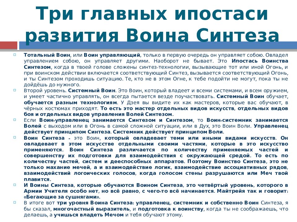 Три главных ипостаси развития Воина Синтеза Тотальный Воин, или Воин управляющий, только в первую очередь он управляет собою. Овладел управлением собою, он управляет другими. Наоборот не бывает. Это Ипостась Воинства Синтезом, когда в твоей голове сложены синтез-технологии, вызывающие тот или иной Огонь, и при воинском действии включается соответствующий Синтез, вызывается соответствующий Огонь, и ты Синтезом проходишь ситуацию. Те, кто не в этом Огне, к тебе подойти не могут, пока ты не дойдёшь до нужного. Второй уровень. Системный Воин. Это Воин, который владеет и всеми системами, и всем оружием, и умеет частично управлять, он всегда пытается везде поучаствовать. Системный Воин обучает, обучается разным технологиям. У Дзея вы видите их как мастеров, которые вас обучают, в чёрных костюмах приходят. То есть это мастер отдельных видов искусств, отдельных видов боя и отдельных видов управления Волей Синтезом. Если Воин-управленец занимается Синтезом и Синтезом, то Воин-системник занимается Волей с выходом или в Огонь в самой сложной ситуации, или в Дух, это Воин Воли. Управленец действует принципом Синтеза. Системник действует принципом Воли. Воин Синтеза - это Воин, который овладевает теми или иными видами искусств. Он овладевает в этом искусстве отдельными своими частями, которые в это искусство применяются. Воин Синтеза различается по количеству применяемых частей и совершенству их подготовки для взаимодействия с окружающей средой. То есть по количеству частей, систем и дееспособных аппаратов. Поэтому Воинство Синтеза, это не только махание мечей, а и взаимодействие логик, взаимодействие ассоциативных рядов, взаимодействий логоических голосов, когда голосом стены разрушаются или Меч твой плавится. И Воины Синтеза, которые обучаются Воином Синтеза, это четвёртый уровень, которого в Армии Учителя особо нет, но всё равно, с чего-то всё начинается. Майтрейя так и говорит: «Бегающие за сушнягами». В итоге вот три уровня Воина Синтеза: управленец, системник и собственно Воин Синтеза, я бы сказал, многочастный выразитель, и подготовка к воинству, когда ты не соображаешь, что делаешь, а учишься владеть Мечом и тебя обучают этому.
