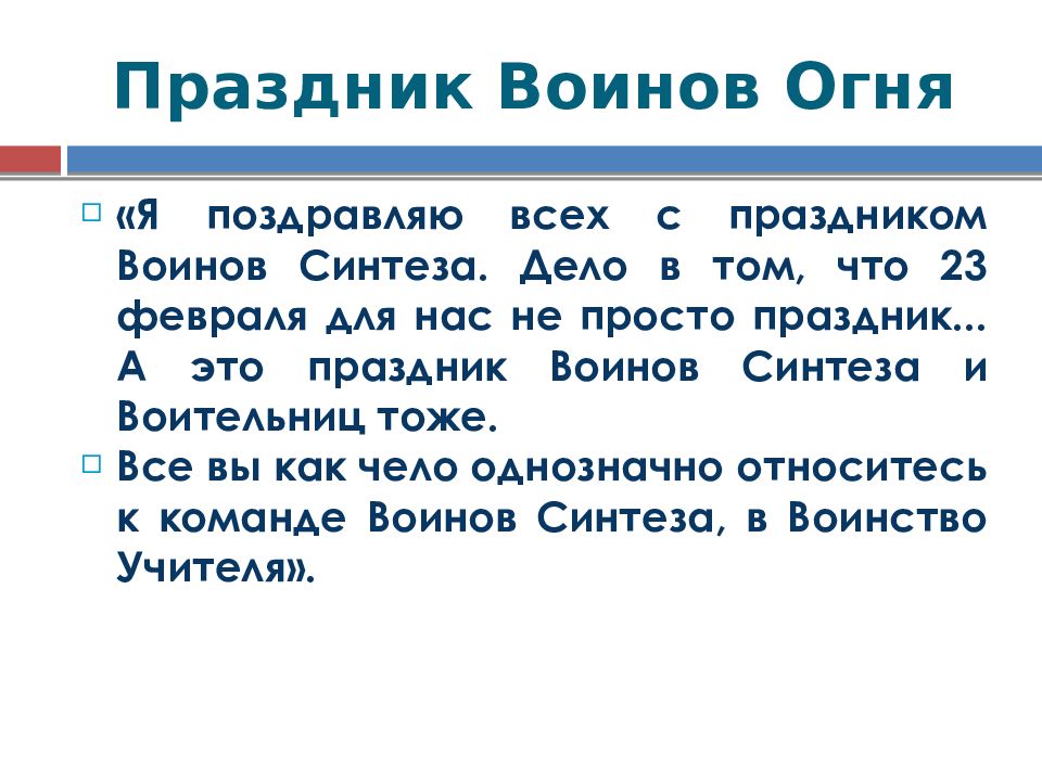 Праздник Воинов Огня «Я поздравляю всех с праздником Воинов Синтеза. Дело в том, что 23 февраля для нас не просто праздник... А это праздник Воинов Синтеза и Воительниц тоже. Все вы как чело однозначно относитесь к команде Воинов Синтеза, в Воинство Учителя».