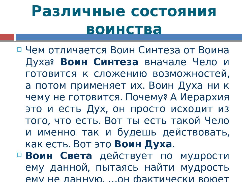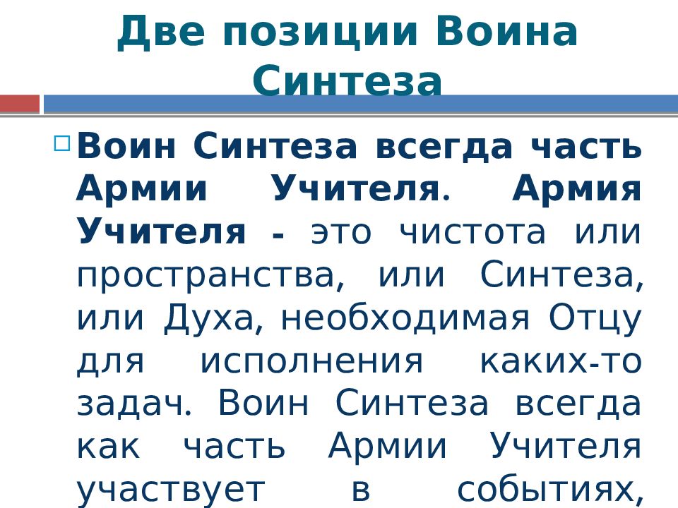 Две позиции Воина Синтеза Воин Синтеза всегда часть Армии Учителя. Армия Учителя - это чистота или пространства, или Синтеза, или Духа, необходимая Отцу для исполнения каких-то задач. Воин Синтеза всегда как часть Армии Учителя участвует в событиях, порученных ему и знает, что он часть Армии Учителя. И там у него своя позиционность, свой отряд, свои задачи, свои связи, если он один не справляется, включается отряд, батальон, полк и так далее. Второй вариант. Воин Синтеза, в первую очередь Чело. Воинство - это внешнее выражение Иерархии. И вот опыт и тренированность Воинства Синтеза заключается в простой вещи, у тебя вначале должен сработать Чело, а потом Воин, чем выше подготовка, тем глубже это явление. Чело должен просчитать, увидеть, сложить картинку, мгновенно ввести функционал нужной части, системы, управления и так далее. А Воин Синтеза, уже потом, примениться всем этим. То есть Воин Синтеза - это внешнее применение Чело, который до этого сложил необходимые возможности. И если ты как Чело не тренируешься на сложение необходимых возможностей, чтоб потом их применить вовне, ты не Воин Синтеза.