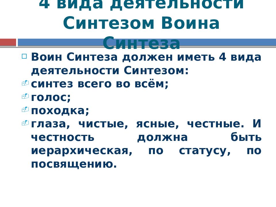 4 вида деятельности Синтезом Воина Синтеза Воин Синтеза должен иметь 4 вида деятельности Синтезом: синтез всего во всём; голос; походка; глаза, чистые, ясные, честные. И честность должна быть иерархическая, по статусу, по посвящению.