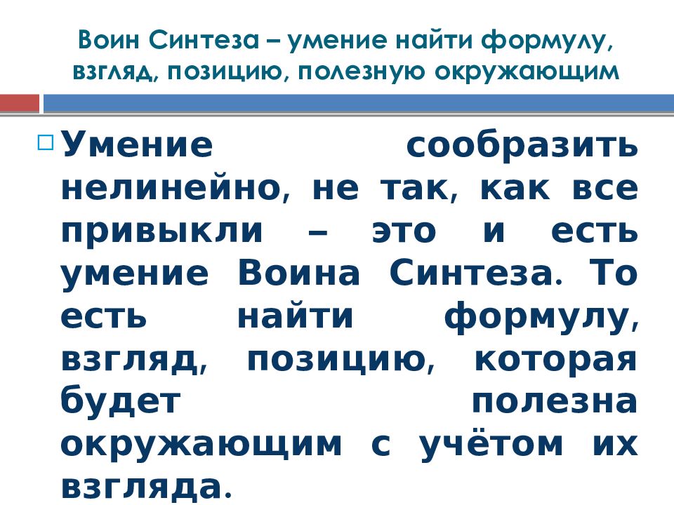 Воин Синтеза – умение найти формулу, взгляд, позицию, полезную окружающим Умение сообразить нелинейно, не так, как все привыкли – это и есть умение Воина Синтеза. То есть найти формулу, взгляд, позицию, которая будет полезна окружающим с учётом их взгляда. Ты выбираешь, чем заниматься тебе в жизни. Выбор твой. Всегда. Вот это Воинство Синтеза. Ты должен понимать, чувствовать, что это тебе не надо, что это не твоё. Если система предусматривает что-то, что вам не совсем нравится, но по системе в другом варианте нельзя, вы действуете по системе. Надо не ломать систему, а развивать её, но выкручивайтесь в этой системе, минимизируя последствия для себя. Это тоже Воинство Синтеза. Нам надо учиться утончённо ходить ситуациями жизни. Это Воинство Синтеза. Нет ни одной ситуации, которая для вас не в Огне, вы в Доме, для вас всё в Огне, даже с близкими. Объяснить можно везде всё. Повышай объяснительные способности, Воинство Синтеза. Называется, владей Алфавитом.