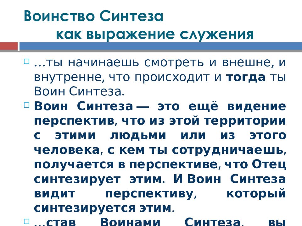 Воинство Синтеза как выражение служения … ты начинаешь смотреть и внешне, и внутренне, что происходит и тогда ты Воин Синтеза. Воин Синтеза — это ещё видение перспектив, что из этой территории с этими людьми или из этого человека, с кем ты сотрудничаешь, получается в перспективе, что Отец синтезирует этим. И Воин Синтеза видит перспективу, который синтезируется этим. … став Воинами Синтеза, вы должны реально понимать и, встав на Путь Воина Синтеза, что Майтрейя вам уже поручил Путь Воина Синтеза и какую-то реализацию. Обязательно, если вы одеваете форму, вы получаете воинство и входите в состав воинства Учителя. И вам стоит выяснить, что вы там получили, подсказываю, будет очень даже полезно, вы хотя бы будете знать, куда двигаться.