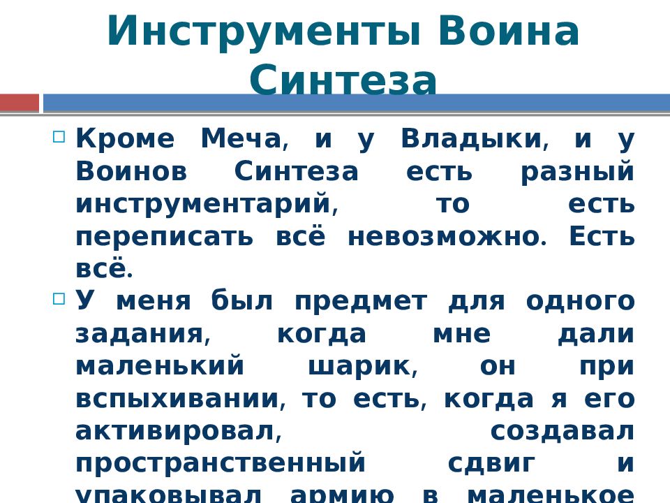 Инструменты Воина Синтеза Кроме Меча, и у Владыки, и у Воинов Синтеза есть разный инструментарий, то есть переписать всё невозможно. Есть всё. У меня был предмет для одного задания, когда мне дали маленький шарик, он при вспыхивании, то есть, когда я его активировал, создавал пространственный сдвиг и упаковывал армию в маленькое пространство, потом она доставлялась на суд Отцу. Есть функциональность разных систем, которыми ты владеешь как Воин Синтеза. И как только по иерархическому уровню ты продвигаешься, с учётом твоих Статусов и Посвящений, тебя кроме Меча, ещё обучают другим каким-то предметам, которые полезны при твоих активациях в агрессивной среде, так скажем. Иногда не в агрессивной среде, бывает просто вообще полезны, потому что мы иногда не замечаем этой полезности, просто находясь в жизни, а они полезны. Надо сделать практику, тебе мешают все, надо включить один из предметов, все пускай мешают, но практика произойдёт.