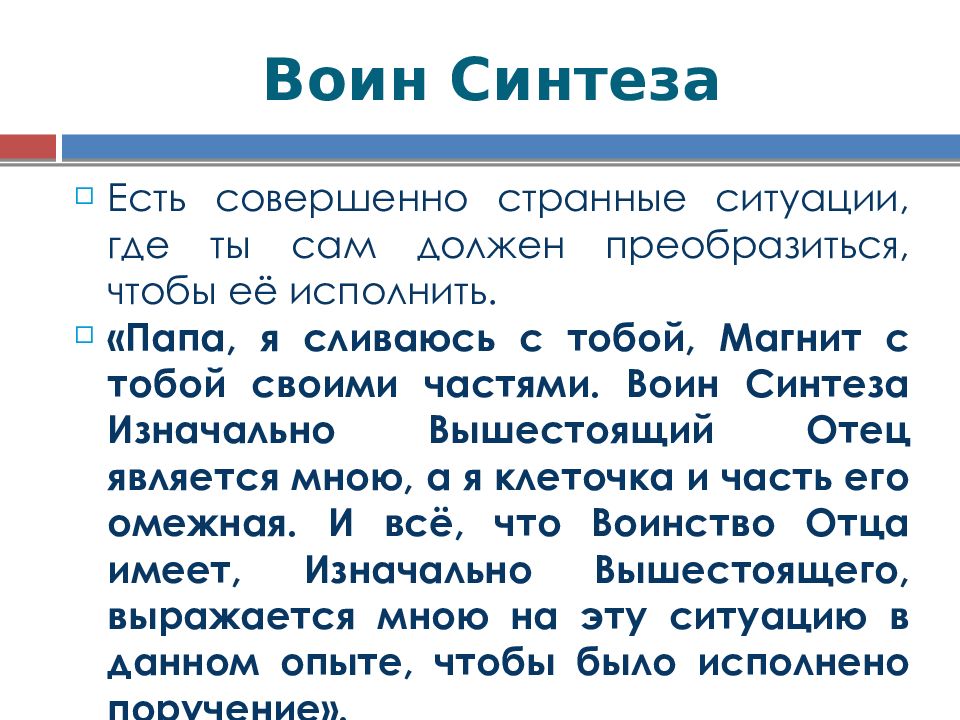 Воин Синтеза Есть совершенно странные ситуации, где ты сам должен преобразиться, чтобы её исполнить. «Папа, я сливаюсь с тобой, Магнит с тобой своими частями. Воин Синтеза Изначально Вышестоящий Отец является мною, а я клеточка и часть его омежная. И всё, что Воинство Отца имеет, Изначально Вышестоящего, выражается мною на эту ситуацию в данном опыте, чтобы было исполнено поручение».