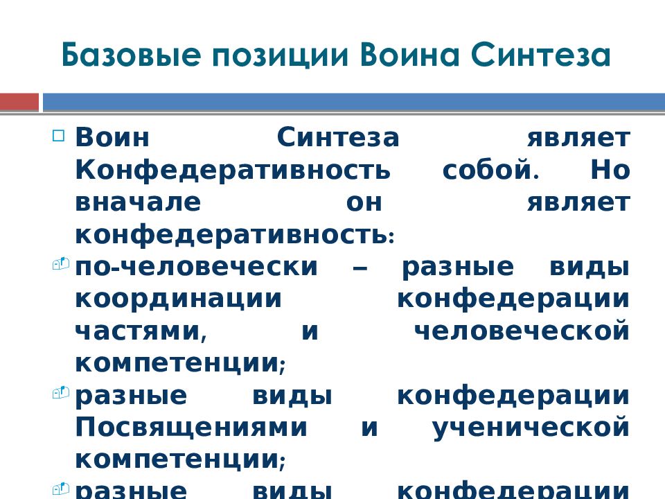 Базовые позиции Воина Синтеза Воин Синтеза являет Конфедеративность собой. Но вначале он являет конфедеративность: по-человечески – разные виды координации конфедерации частями, и человеческой компетенции; разные виды конфедерации Посвящениями и ученической компетенции; разные виды конфедерации Статусами и компетенции Ведущего. И так далее. И слово «разные виды конфедеративной компетенции» здесь главные.