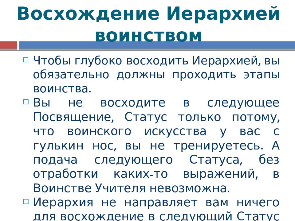 Восхождение Иерархией воинством Чтобы глубоко восходить Иерархией, вы обязательно должны проходить этапы воинства. Вы не восходите в следующее Посвящение, Статус только потому, что воинского искусства у вас с гулькин нос, вы не тренируетесь. А подача следующего Статуса, без отработки каких-то выражений, в Воинстве Учителя невозможна. Иерархия не направляет вам ничего для восхождение в следующий Статус только потому, что у вас нет навыков внешнего воинского применения. Отсюда внешнее воинское применение при иерархическом росте - это когда ты получил иерархически новое Посвящение, научился им владеть. А итогово, чтоб показать, что это Посвящение тобою усвоено, ты должен его применить вовне. Применение вовне данных тебе Посвящений и Статусов, в Иерархии называется воинством и воинским искусством.