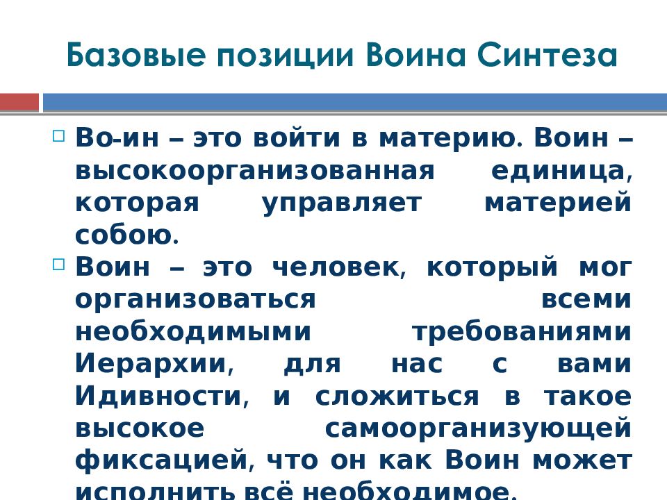 Базовые позиции Воина Синтеза Во-ин – это войти в материю. Воин – высокоорганизованная единица, которая управляет материей собою. Воин – это человек, который мог организоваться всеми необходимыми требованиями Иерархии, для нас с вами Идивности, и сложиться в такое высокое самоорганизующей фиксацией, что он как Воин может исполнить всё необходимое. Необходимо накопить разные виды Синтеза, чтобы быть Воином в этой высокой самоорганизации, и в материи примениться этим. Меч и другие инструменты – это очень важные тренировки Воина, которые позволяют примениться Синтезом, но это дополнительный инструмент. Главное в названии – Воин Синтеза. Мы вначале были Воинами Синтеза. И Владыки из внешней реальности, как Воин Света, действие внешнее, перешли во внутреннюю реальность, как Воин Синтеза, действующий Синтезом.