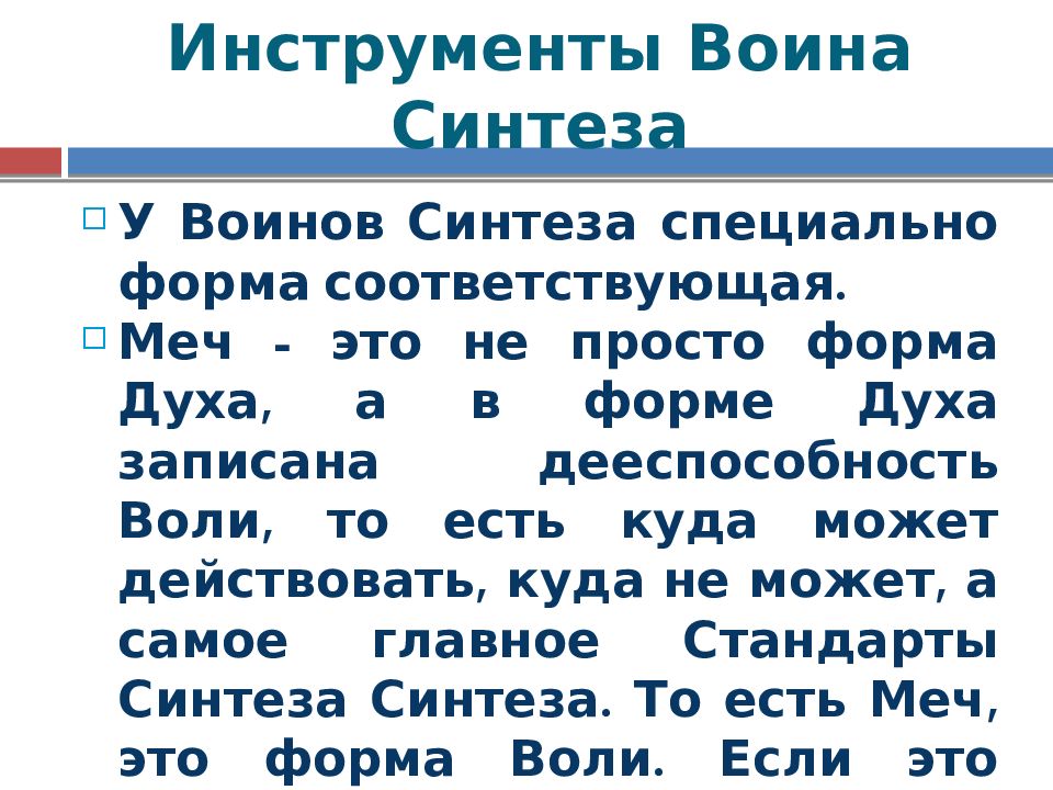 Инструменты Воина Синтеза У Воинов Синтеза специально форма соответствующая. Меч - это не просто форма Духа, а в форме Духа записана дееспособность Воли, то есть куда может действовать, куда не может, а самое главное Стандарты Синтеза Синтеза. То есть Меч, это форма Воли. Если это форма Воли, Воля - это записи Духа. Значит, Меч имеет набор записей Воли вызывающих определённый Дух, а при вызывании определённого Духа, это вызывает определённую дееспособность как частей, так и окружающего пространства, с учётом того, что Воля и Дух развёртывают пространство. Поэтому Меч - это очень интересный объект, иногда субъект. Это синтез Воли с активацией Духа субъективно объективно вокруг нас. Если у Воина Синтеза подготовка высока, то Мечом Воли он вызывает не только активацию Духа вокруг или внутри себя, а и ещё активацию Синтеза. Воля пишется Синтезом, тогда Меч начинает сиять Синтезом и начинается взаимодействие огненное разных частей, систем внутри нас или разных огненных взаимодействий вокруг нас. В Огонь записан Синтез, он может начать действовать при активном применении Синтеза Мечом. Поэтому Меч может применяться Синтезом. И вершина воинского искусства Новой Эпохи - это Воины Синтеза, когда Меч применяется не Духом, а Синтезом, Синтезом записанной Воли. Если Меч применяется просто Волей, это второй уровень, и Меч, который применяется Духом, в основном у всех, это стандарт Меча. Вот эти три вида Меча с разными его выражениями надо отметить.