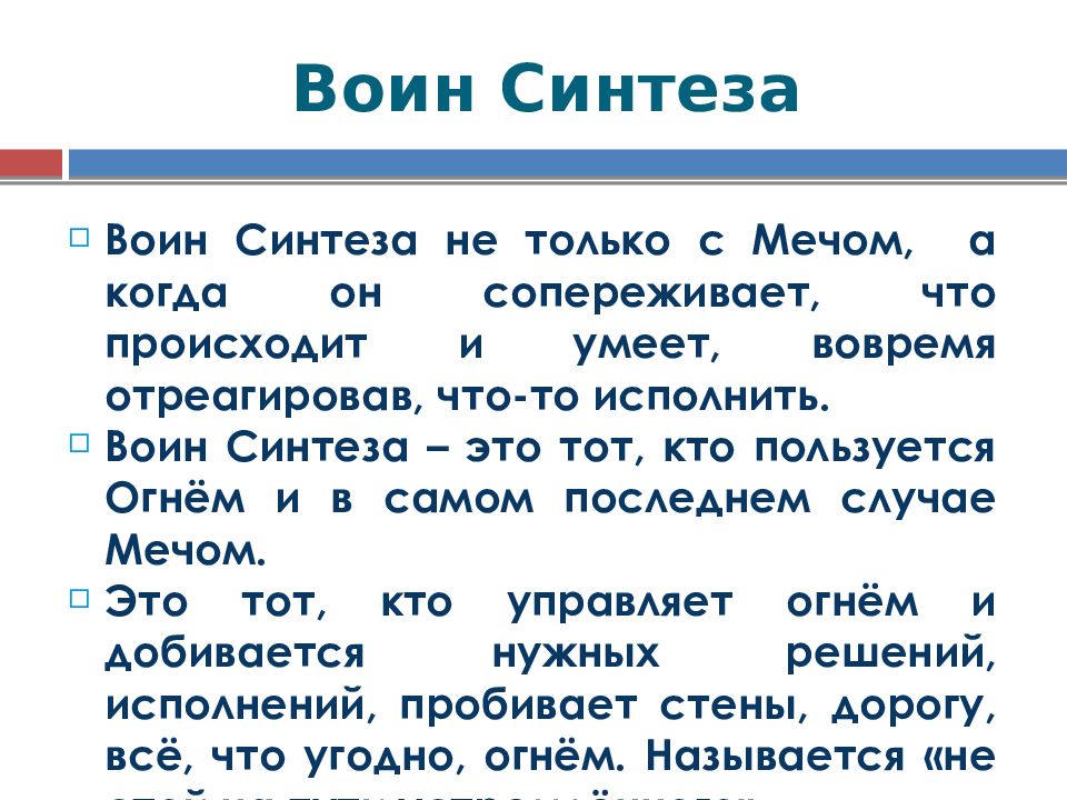 Воин Синтеза Воин Синтеза не только с Мечом, а когда он сопереживает, что происходит и умеет, вовремя отреагировав, что-то исполнить. Воин Синтеза – это тот, кто пользуется Огнём и в самом последнем случае Мечом. Это тот, кто управляет огнём и добивается нужных решений, исполнений, пробивает стены, дорогу, всё, что угодно, огнём. Называется «не стой на пути устремлённого». Впереди него бежит огонь, за ним устремлённость – это Воин Синтеза.