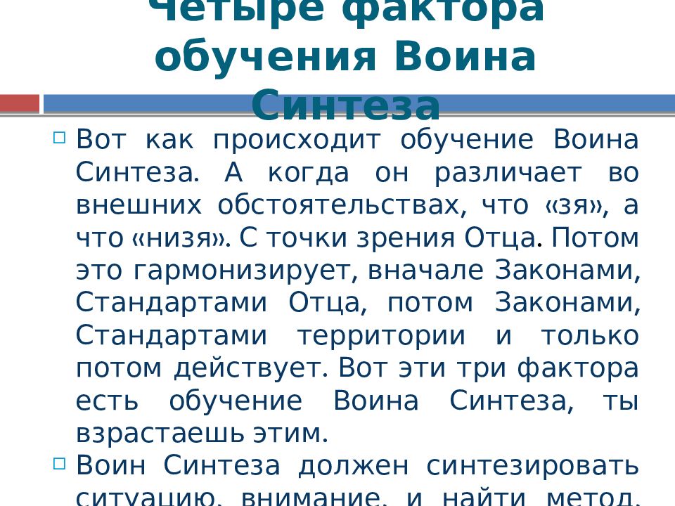 Четыре фактора обучения Воина Синтеза Вот как происходит обучение Воина Синтеза. А когда он различает во внешних обстоятельствах, что «зя», а что «низя». С точки зрения Отца. Потом это гармонизирует, вначале Законами, Стандартами Отца, потом Законами, Стандартами территории и только потом действует. Вот эти три фактора есть обучение Воина Синтеза, ты взрастаешь этим. Воин Синтеза должен синтезировать ситуацию, внимание, и найти метод, как из неё выкрутиться, тогда ваше воинство растёт. Причём, внимание, в любом направлении. Вот Воинство Синтеза растёт вашими умениями выкручиваться из всех ситуаций. Выкрутасик не в том, что ты идёшь против, а в том то, что ты складываешь законы не так, как все видят – раз. В том, что ты делаешь выводы не так, как все делают – два. Не так, как все привыкли – три. И самое главное не так как все хотят – четыре. После этого ты Воин Синтеза.