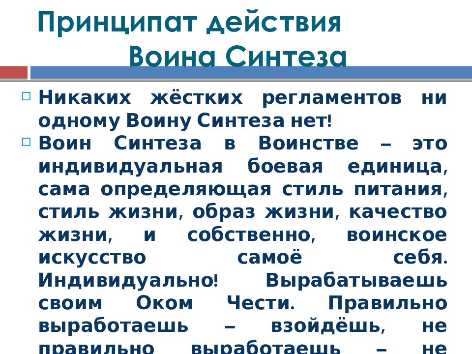 Принципат действия Воина Синтеза Никаких жёстких регламентов ни одному Воину Синтеза нет! Воин Синтеза в Воинстве – это индивидуальная боевая единица, сама определяющая стиль питания, стиль жизни, образ жизни, качество жизни, и собственно, воинское искусство самоё себя. Индивидуально! Вырабатываешь своим Оком Чести. Правильно выработаешь – взойдёшь, не правильно выработаешь – не взойдёшь. Среда, питание, Меч – это три важнейших базы любого Воина. Воинство Учителя – это, прежде всего, служение другим. В Воинстве Учителя учитываются любые поручения, достижения, опыт лично ваш, если он в будущем поможет любому другому. Если один достиг – получили все. Тогда это Воинство.