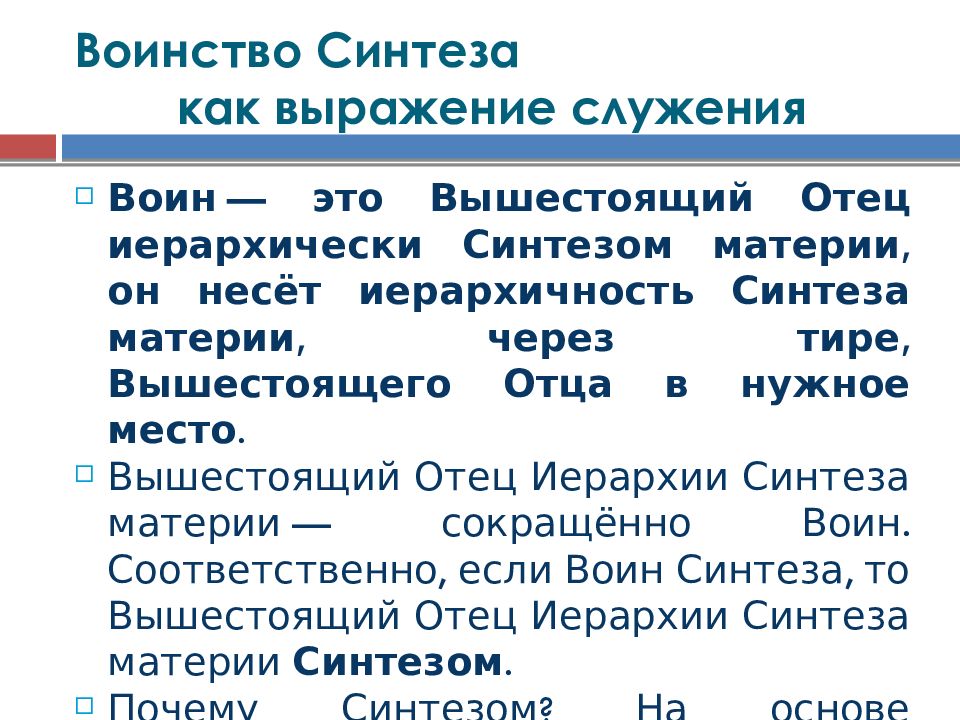 Воинство Синтеза как выражение служения Воин — это Вышестоящий Отец иерархически Синтезом материи, он несёт иерархичность Синтеза материи, через тире, Вышестоящего Отца в нужное место. Вышестоящий Отец Иерархии Синтеза материи — сокращённо Воин. Соответственно, если Воин Синтеза, то Вышестоящий Отец Иерархии Синтеза материи Синтезом. Почему Синтезом? На основе стандартов Синтеза, законов Синтеза. Воин Синтеза, ты должен уметь войти в любую материю, примениться любым способом, если надо тебе донести Синтез. Настоящий Воин — это когда никто его не видит, но всё происходит так, как ему надо.