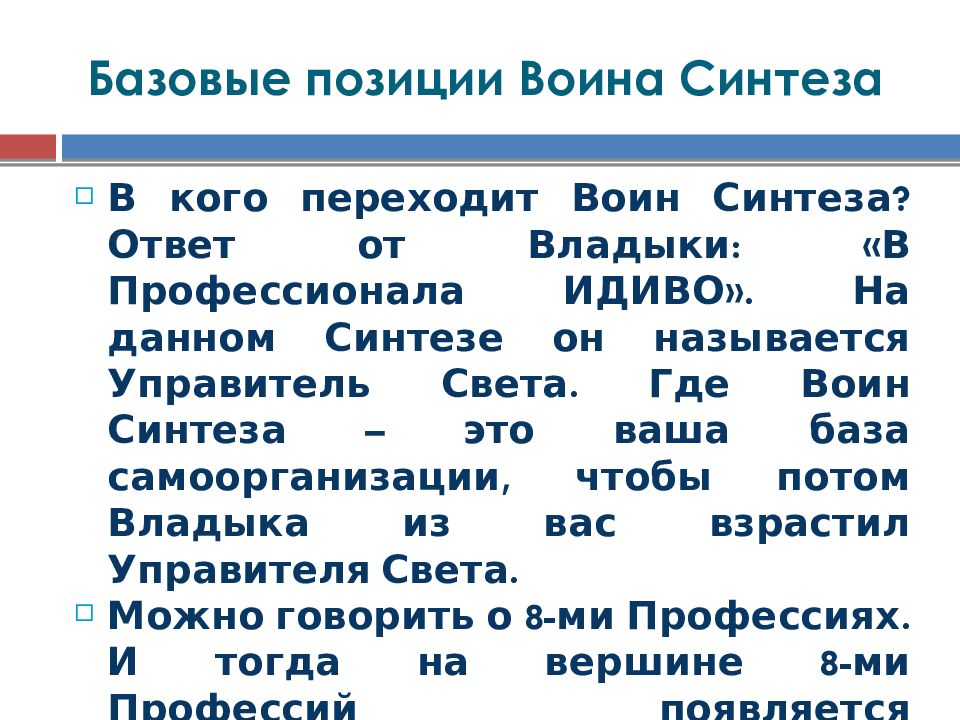 Базовые позиции Воина Синтеза В кого переходит Воин Синтеза? Ответ от Владыки: «В Профессионала ИДИВО». На данном Синтезе он называется Управитель Света. Где Воин Синтеза – это ваша база самоорганизации, чтобы потом Владыка из вас взрастил Управителя Света. Можно говорить о 8-ми Профессиях. И тогда на вершине 8-ми Профессий появляется Профессионал ИДИВО. Соответственно, Воин Синтеза обязан накопить некий объём Синтеза для такой профессионализации. Нужен Синтеза на каждый вид Жизни в профессиональном применении. ФЧ 3-го ПС ИВО «Управитель Света», 22-23 ноября, 2014г., г. Новосибирск