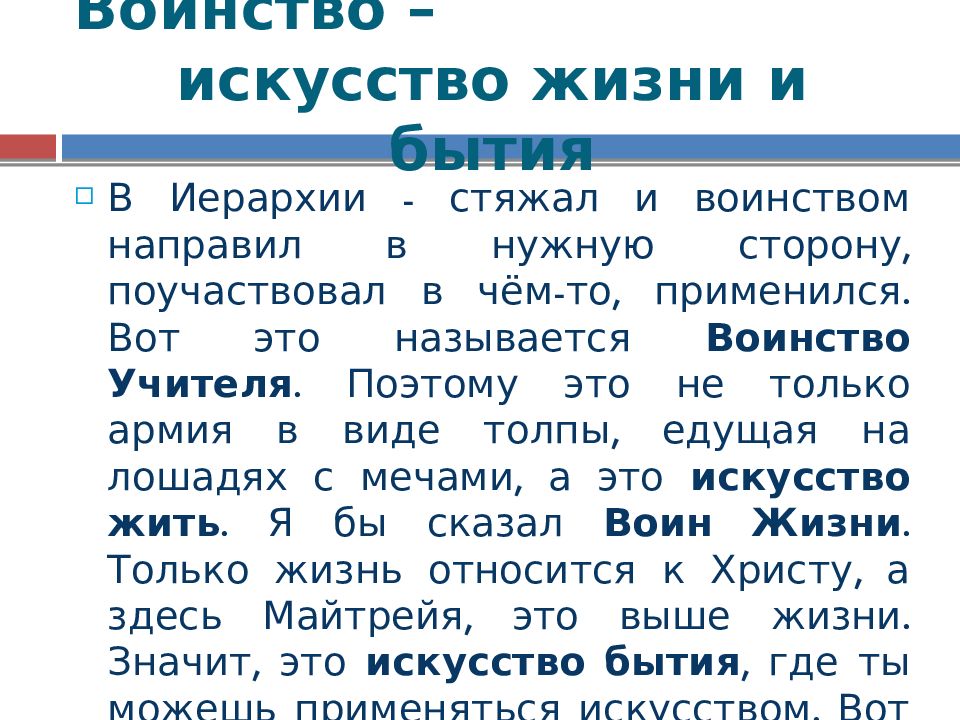 Воинство – искусство жизни и бытия В Иерархии - стяжал и воинством направил в нужную сторону, поучаствовал в чём-то, применился. Вот это называется Воинство Учителя. Поэтому это не только армия в виде толпы, едущая на лошадях с мечами, а это искусство жить. Я бы сказал Воин Жизни. Только жизнь относится к Христу, а здесь Майтрейя, это выше жизни. Значит, это искусство бытия, где ты можешь применяться искусством. Вот это воинство Новой Эпохи. Искусство бытия. Жизнь относится к Христу, бытиё к Майтрейе. Соответственно, качество вашего бытия возрастает качеством воинского искусства. Просто на глазах меняется тенденция жизни.