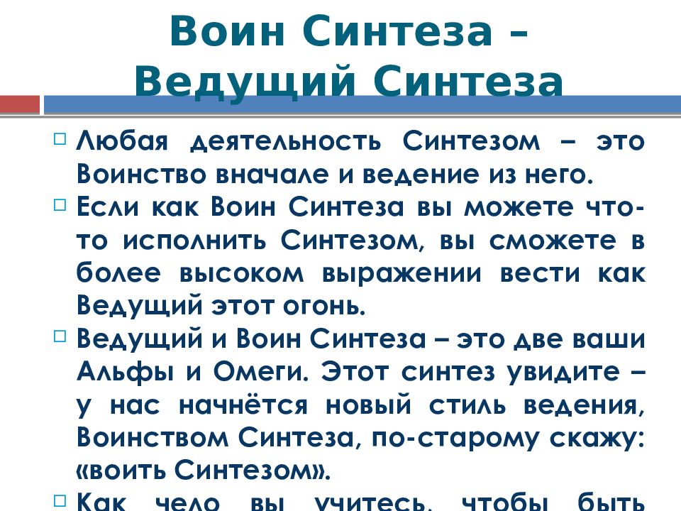 Воин Синтеза – Ведущий Синтеза Любая деятельность Синтезом – это Воинство вначале и ведение из него. Если как Воин Синтеза вы можете что-то исполнить Синтезом, вы сможете в более высоком выражении вести как Ведущий этот огонь. Ведущий и Воин Синтеза – это две ваши Альфы и Омеги. Этот синтез увидите – у нас начнётся новый стиль ведения, Воинством Синтеза, по-старому скажу: «воить Синтезом». Как чело вы учитесь, чтобы быть Ведущим, а как Воин вы должны своё ведение уметь выражать вовне. Воинство Синтеза – это применение Синтезом везде, только качественно и эффективно. 4 круг Профессионального Синтеза ИДИВО 23-24 февраля 2013 года, Краснодар