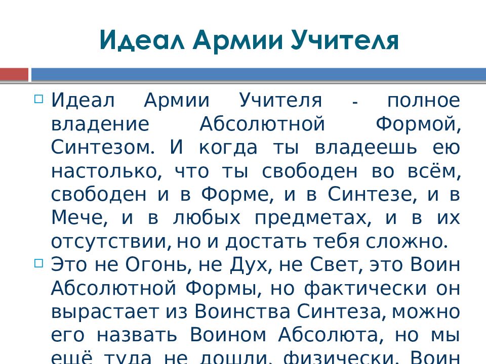 Идеал Армии Учителя Идеал Армии Учителя - полное владение Абсолютной Формой, Синтезом. И когда ты владеешь ею настолько, что ты свободен во всём, свободен и в Форме, и в Синтезе, и в Мече, и в любых предметах, и в их отсутствии, но и достать тебя сложно. Это не Огонь, не Дух, не Свет, это Воин Абсолютной Формы, но фактически он вырастает из Воинства Синтеза, можно его назвать Воином Абсолюта, но мы ещё туда не дошли, физически. Воин Абсолютной Формы уже хоть как-то, Воина Абсолюта у нас нет.