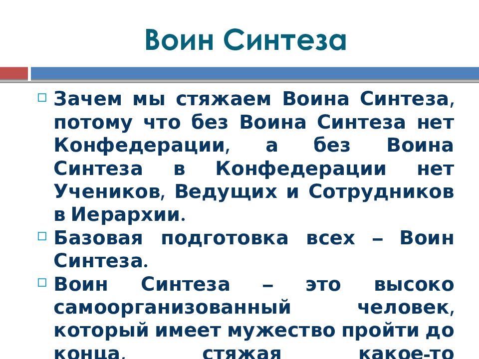 Воин Синтеза Зачем мы стяжаем Воина Синтеза, потому что без Воина Синтеза нет Конфедерации, а без Воина Синтеза в Конфедерации нет Учеников, Ведущих и Сотрудников в Иерархии. Базовая подготовка всех – Воин Синтеза. Воин Синтеза – это высоко самоорганизованный человек, который имеет мужество пройти до конца, стяжая какое-то Посвящение, Статус или выполняя какое-то задание. Любое задание, которое даётся от Владык,… это прежде всего воинское искусство. И у вас включается Воин Синтеза, а потом всё остальное.