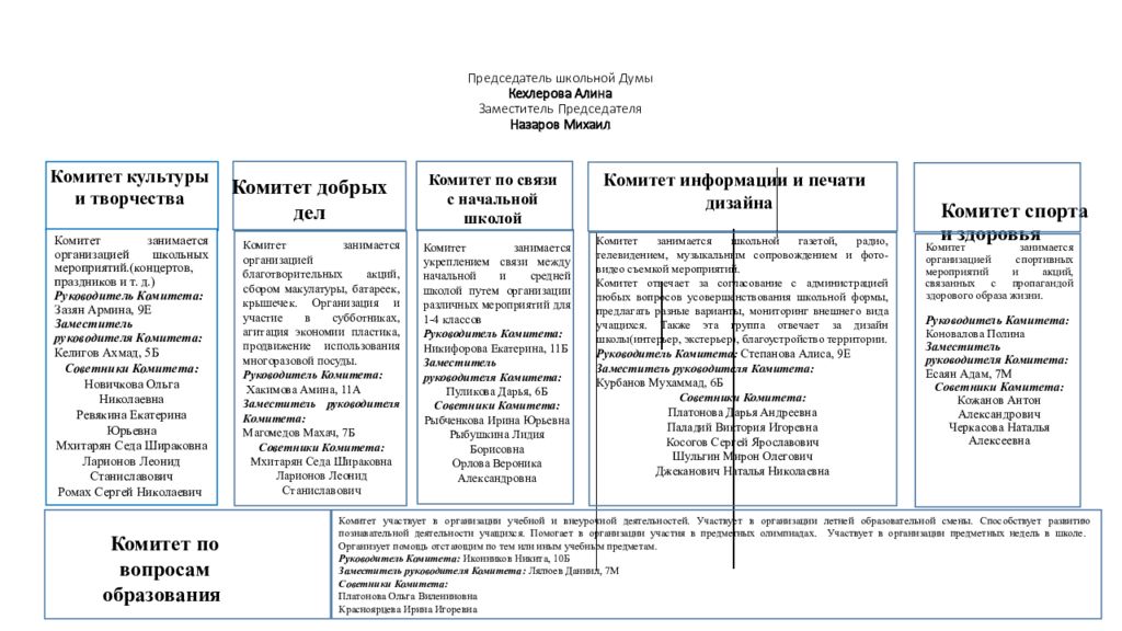 Комитет занимается организацией школьных мероприятий.(концертов, праздников и т. д.) Руководитель Комитета: Зазян Армина, 9Е Заместитель руководителя Комитета: Келигов Ахмад, 5Б Советники Комитета: Новичкова Ольга Николаевна Ревякина Екатерина Юрьевна Мхитарян Седа Шираковна Ларионов Леонид Станиславович Ромах Сергей Николаевич Комитет спорта и здоровья Комитет занимается организацией спортивных мероприятий и акций, связанных с пропагандой здорового образа жизни. Руководитель Комитета : Коновалова Полина Заместитель руководителя Комитета : Есаян Адам, 7М Советники Комитета: Кожанов Антон Александрович Черкасова Наталья Алексеевна Комитет занимается школьной газетой, радио, телевидением, музыкальным сопровождением и фото-видео съемкой мероприятий. Комитет отвечает за согласование с администрацией любых вопросов усовершенствования школьной формы, предлагать разные варианты, мониторинг внешнего вида учащихся. Также эта группа отвечает за дизайн школы(интерьер, экстерьер), благоустройство территории. Руководитель Комитета : Степанова Алиса, 9Е Заместитель руководителя Комитета : Курбанов Мухаммад, 6Б Советники Комитета : Платонова Дарья Андреевна Паладий Виктория Игоревна Косогов Сергей Ярославович Шульгин Мирон Олегович Джеканович Наталья Николаевна Комитет культуры и творчества Комитет добрых дел Комитет занимается организацией благотворительных акций, сбором макулатуры, батареек, крышечек. Организация и участие в субботниках, агитация экономии пластика, продвижение использования многоразовой посуды. Руководитель Комитета : Хакимова Амина, 11А Заместитель руководителя Комитета : Магомедов Махач, 7Б Советники Комитета : Мхитарян Седа Шираковна Ларионов Леонид Станиславович Комитет по связи с начальной школой Комитет занимается укреплением связи между начальной и средней школой путем организации различных мероприятий для 1-4 классов Руководитель Комитета: Никифорова Екатерина, 11Б Заместитель руководителя Комитета: Пуликова Дарья, 6Б Советники Комитета : Рыбченкова Ирина Юрьевна Рыбушкина Лидия Борисовна Орлова Вероника Александровна Комитет информации и печати дизайна Комитет по вопросам образования Комитет участвует в организации учебной и внеурочной деятельностей. Участвует в организации летней образовательной смены. Способствует развитию познавательной деятельности учащихся. Помогает в организации участия в предметных олимпиадах. Участвует в организации предметных недель в школе. Организует помощь отстающим по тем или иным учебным предметам. Руководитель Комитета : Иконников Никита, 10Б Заместитель руководителя Комитета : Лялюев Даниил, 7М Советники Комитета: Платонова Ольга Вилениновна Красноярцева Ирина Игоревна
