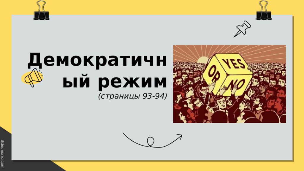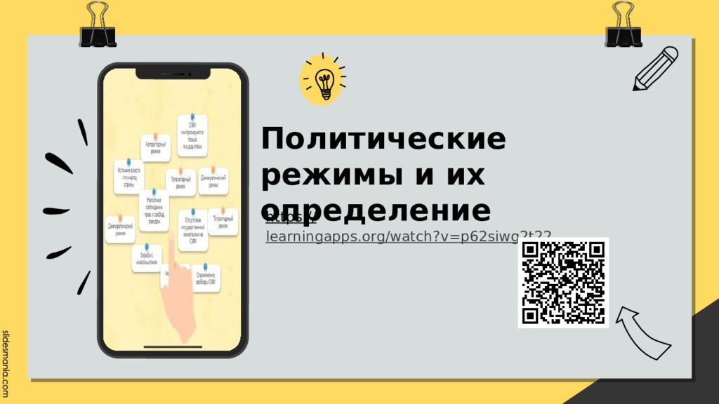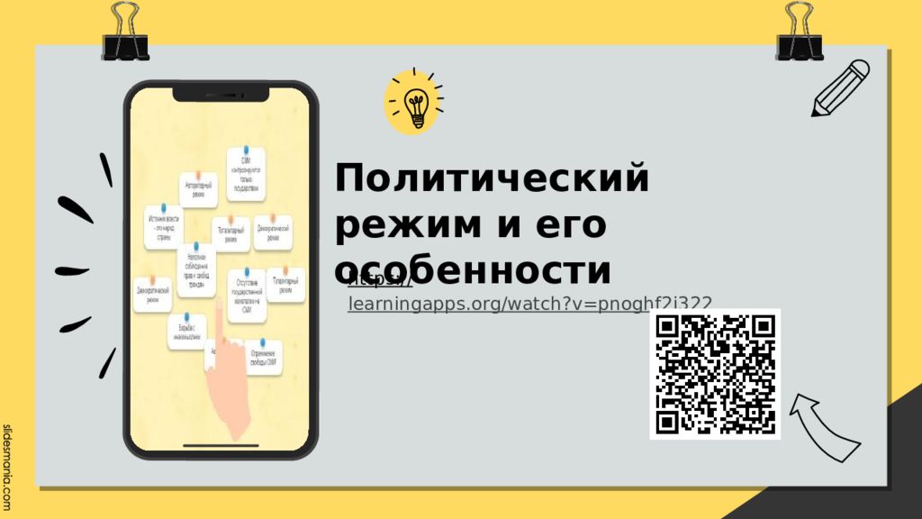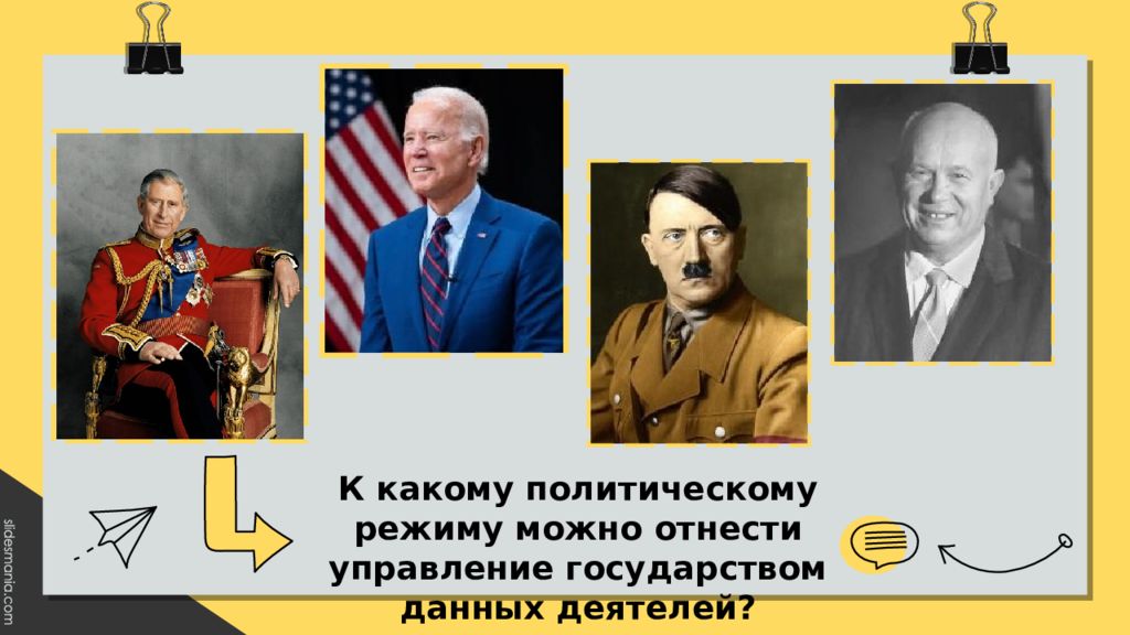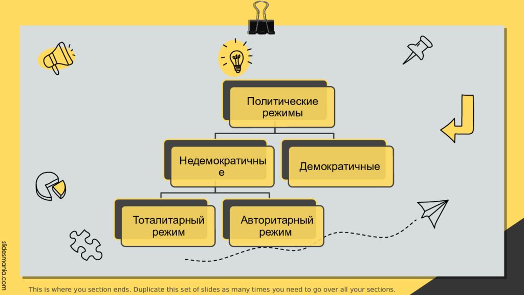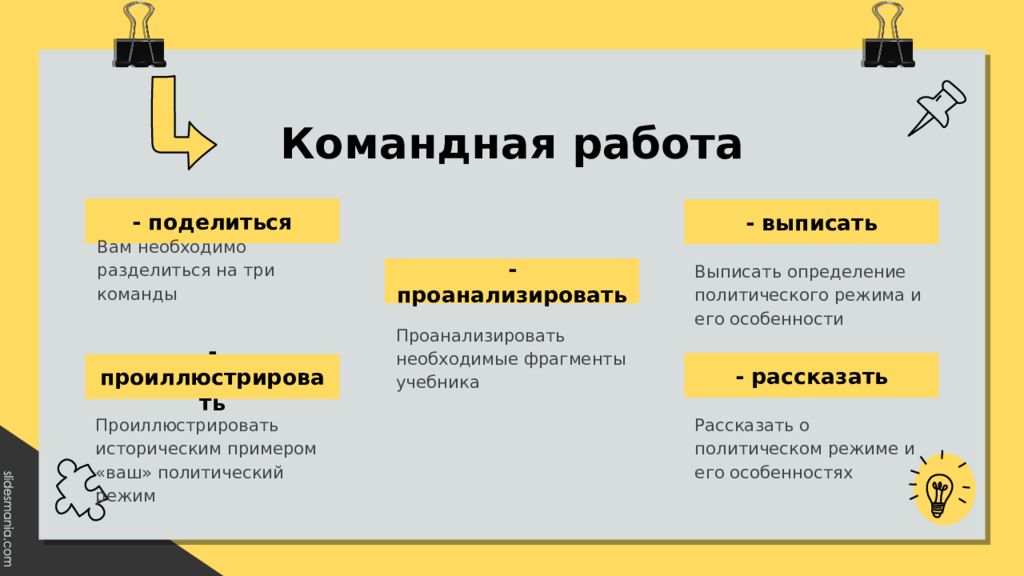 - поделиться Рассказать о политическом режиме и его особенностях - проиллюстрировать Вам необходимо разделиться на три команды - выписать Проиллюстрировать историческим примером «ваш» политический режим - проанализировать - рассказать Проанализировать необходимые фрагменты учебника Выписать определение политического режима и его особенности