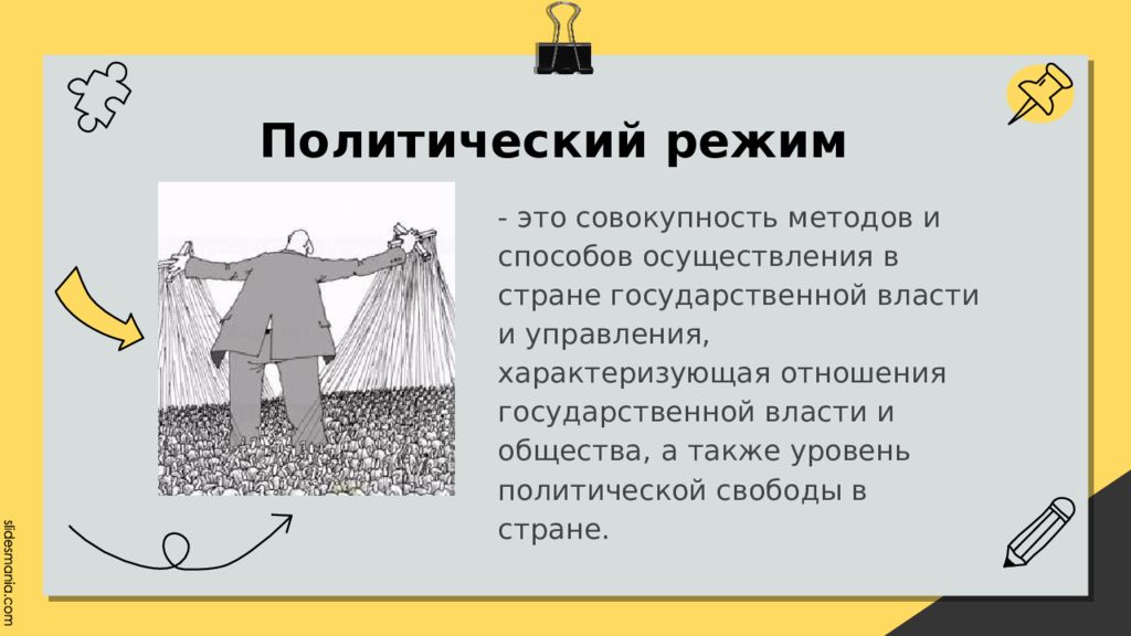 - это совокупность методов и способов осуществления в стране государственной власти и управления, характеризующая отношения государственной власти и общества, а также уровень политической свободы в стране.