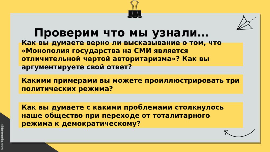 Как вы думаете верно ли высказывание о том, что «Монополия государства на СМИ является отличительной чертой авторитаризма»? Как вы аргументируете свой ответ? Какими примерами вы можете проиллюстрировать три политических режима? Как вы думаете с какими проблемами столкнулось наше общество при переходе от тоталитарного режима к демократическому?