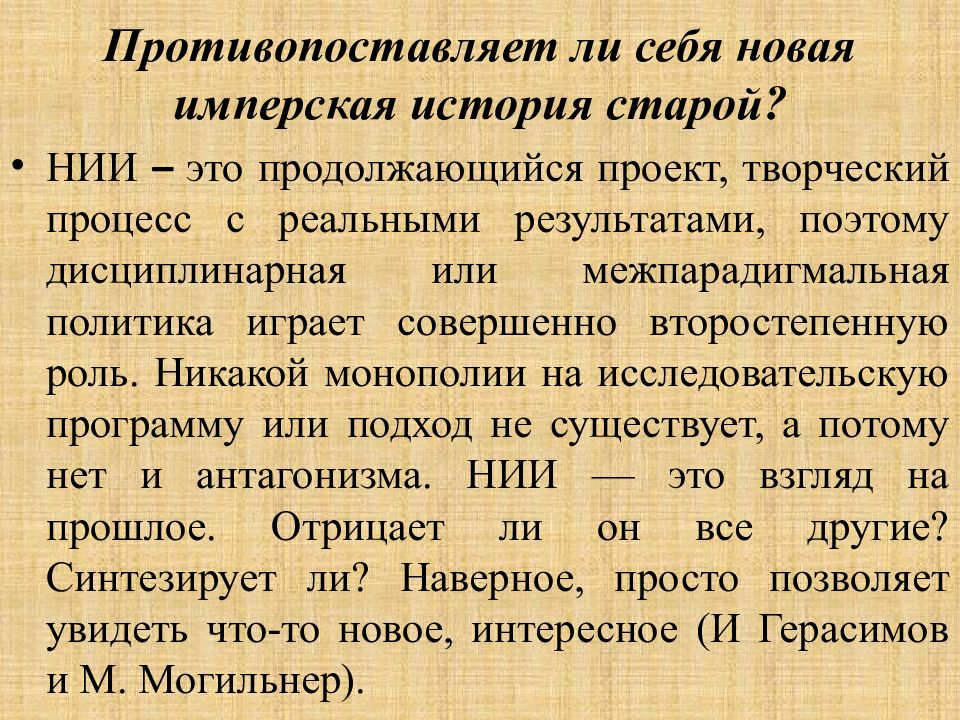 НИИ – это продолжающийся проект, творческий процесс с реальными результатами, поэтому дисциплинарная или межпарадигмальная политика играет совершенно второстепенную роль. Никакой монополии на исследовательскую программу или подход не существует, а потому нет и антагонизма. НИИ — это взгляд на прошлое. Отрицает ли он все другие? Синтезирует ли? Наверное, просто позволяет увидеть что-то новое, интересное (И Герасимов и М. Могильнер ).