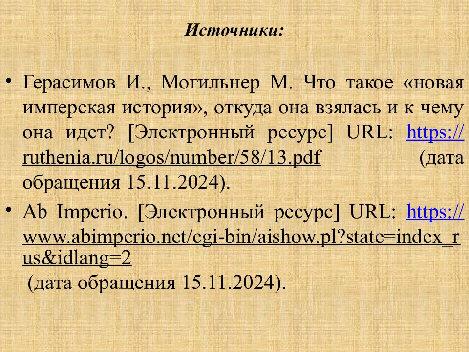 Герасимов И., Могильнер М. Что такое «новая имперская история», откуда она взялась и к чему она идет ? [Электронный ресурс] URL: https:// ruthenia.ru/logos/number/58/13.pdf (дата обращения 15.11.2024). Ab Imperio. [Электронный ресурс] URL: https :// www.abimperio.net/cgi-bin/aishow.pl?state=index_rus&idlang=2 (дата обращения 15.11.2024).