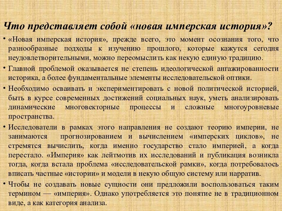 «Новая имперская история», прежде всего, это момент осознания того, что разнообразные подходы к изучению прошлого, которые кажутся сегодня неудовлетворительными, можно переомыслить как некую единую традицию. Главной проблемой оказывается не степень идеологической ангажированности историка, а более фундаментальные элементы исследовательской оптики. Н еобходимо осваивать и экспериментировать с новой политической историей, быть в курсе современных достижений социальных наук, уметь анализировать динамические многовекторные процессы и сложные многоуровневые пространства. Исследователи в рамках этого направления не создают теорию империи, не занимаются прогнозированием и вычислением «имперских циклов», не стремятся вычислить, когда именно государство стало империей, а когда перестало. «Империя » как лейтмотив их исследований и публикация возникла тогда, когда встала проблема «исследовательской рамки», когда потребовалось вписать частные «истории» и модели в некую общую систему или нарратив. Чтобы не создавать новые сущности они предложили воспользоваться таким термином — «империя». Однако употребляется это понятие не в традиционном виде, а как категория анализа.