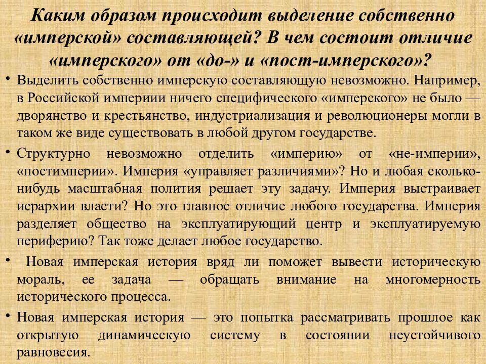 Слайд 9: Каким образом происходит выделение собственно «имперской» составляющей? В чем состоит отличие «имперского» от «до-» и «пост-имперского»?