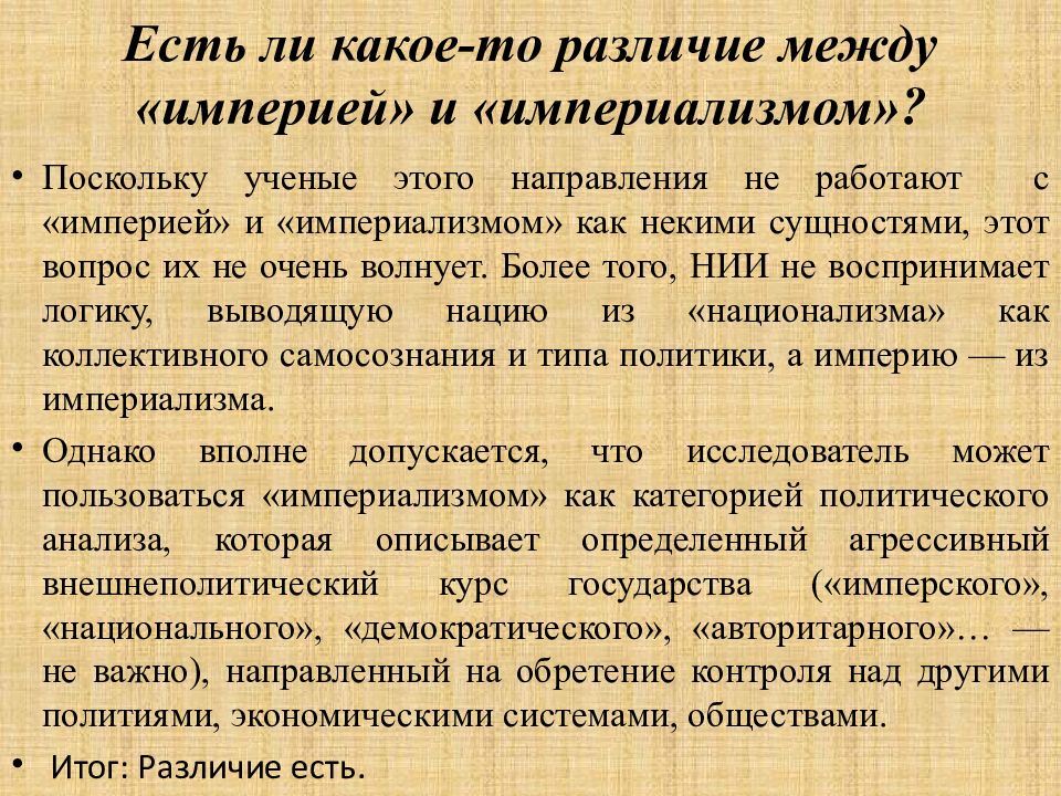 Поскольку ученые этого направления не работают с «империей» и «империализмом» как некими сущностями, этот вопрос их не очень волнует. Более того, НИИ не воспринимает логику, выводящую нацию из «национализма» как коллективного самосознания и типа политики, а империю — из империализма. Однако вполне допускается, что исследователь может пользоваться «империализмом» как категорией политического анализа, которая описывает определенный агрессивный внешнеполитический курс государства («имперского», «национального», «демократического», «авторитарного»… — не важно), направленный на обретение контроля над другими политиями, экономическими системами, обществами. Итог : Различие есть.