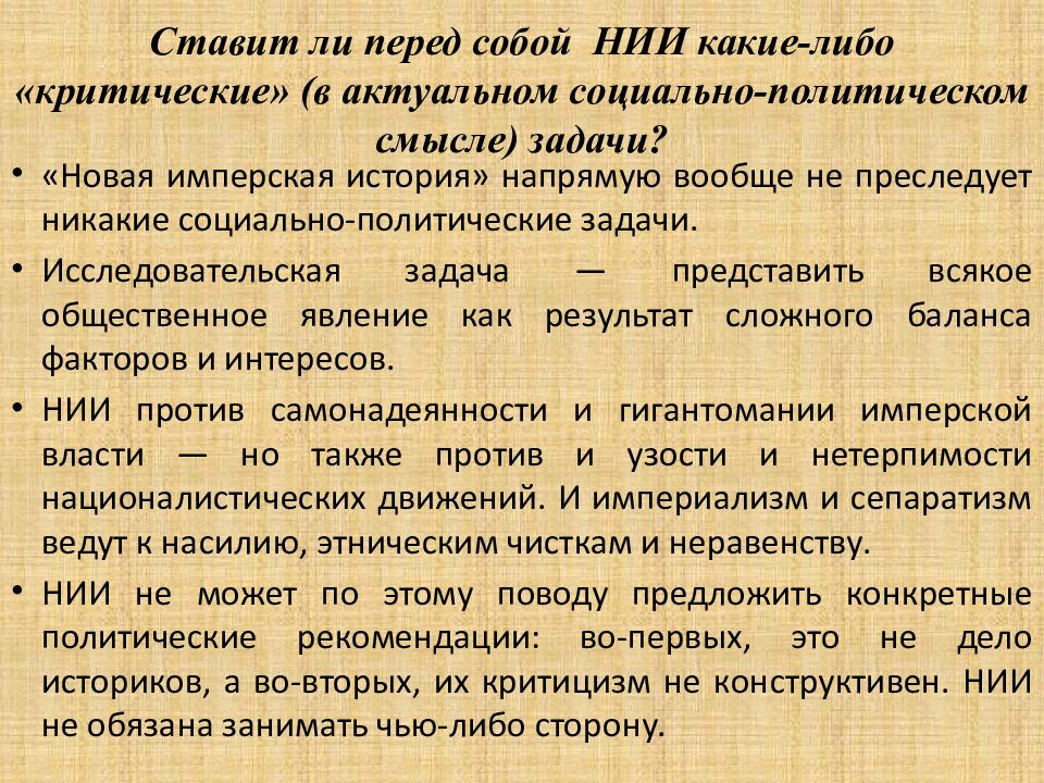 «Новая имперская история» напрямую вообще не преследует никакие социально-политические задачи. Исследовательская задача — представить всякое общественное явление как результат сложного баланса факторов и интересов. НИИ против самонадеянности и гигантомании имперской власти — но также против и узости и нетерпимости националистических движений. И империализм и сепаратизм ведут к насилию, этническим чисткам и неравенству. НИИ не может по этому поводу предложить конкретные политические рекомендации: во-первых, это не дело историков, а во-вторых, их критицизм не конструктивен. НИИ не обязана занимать чью-либо сторону.