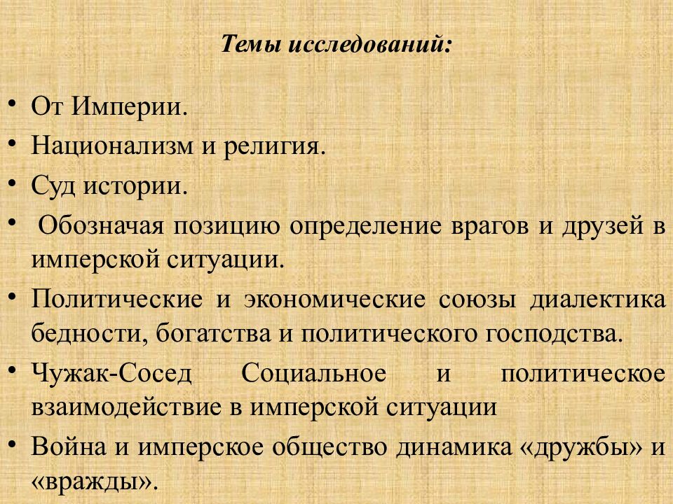 От Империи. Национализм и религия. Суд истории. Обозначая позицию определение врагов и друзей в имперской ситуации. Политические и экономические союзы диалектика бедности, богатства и политического господства. Чужак-Сосед Социальное и политическое взаимодействие в имперской ситуации Война и имперское общество динамика «дружбы» и «вражды».