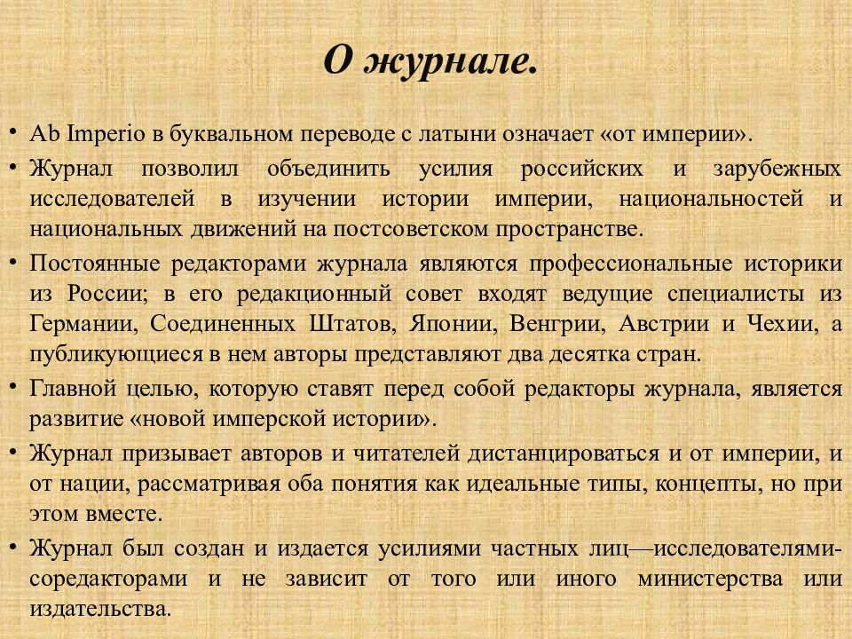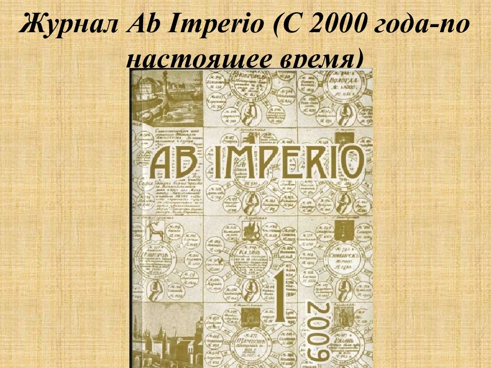 Ab Imperio в буквальном переводе с латыни означает «от империи ». Журнал позволил объединить усилия российских и зарубежных исследователей в изучении истории империи, национальностей и национальных движений на постсоветском пространстве. Постоянные редакторами журнала являются профессиональные историки из России; в его редакционный совет входят ведущие специалисты из Германии, Соединенных Штатов, Японии, Венгрии, Австрии и Чехии, а публикующиеся в нем авторы представляют два десятка стран. Главной целью, которую ставят перед собой редакторы журнала, является развитие «новой имперской истории ». Журнал призывает авторов и читателей дистанцироваться и от империи, и от нации, рассматривая оба понятия как идеальные типы, концепты, но при этом вместе. Журнал был создан и издается усилиями частных лиц—исследователями-соредакторами и не зависит от того или иного министерства или издательства.