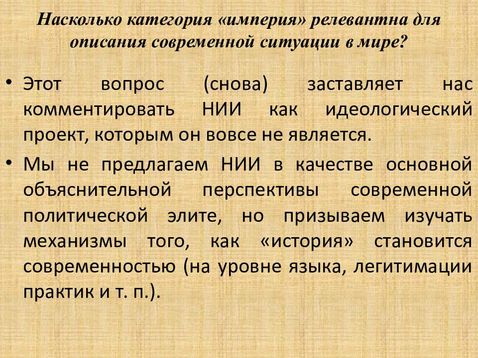Этот вопрос (снова) заставляет нас комментировать НИИ как идеологический проект, которым он вовсе не является. Мы не предлагаем НИИ в качестве основной объяснительной перспективы современной политической элите, но призываем изучать механизмы того, как «история» становится современностью (на уровне языка, легитимации практик и т. п.).