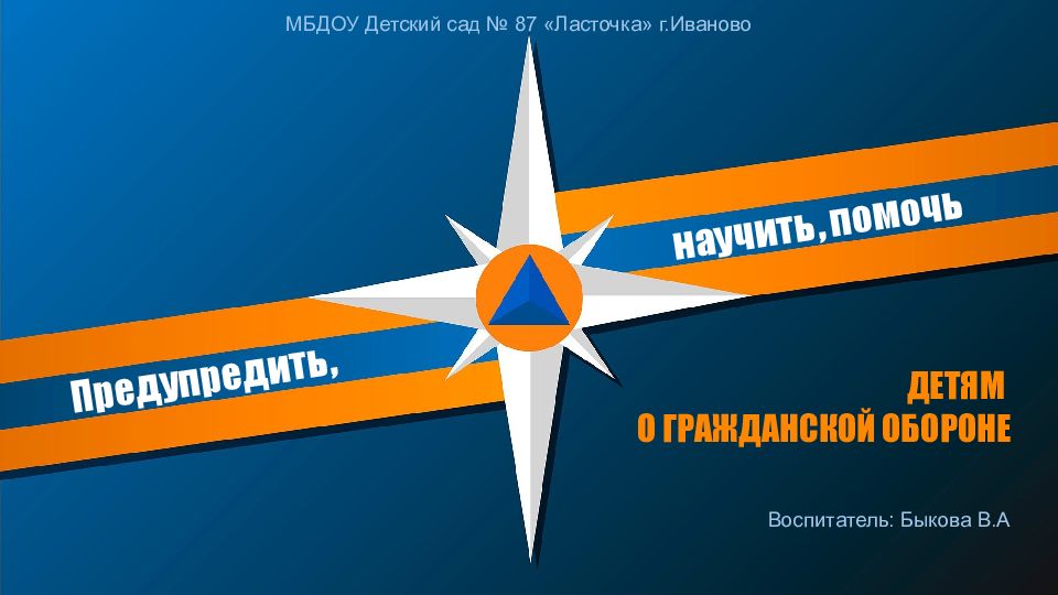 МБДОУ Детский сад № 87 «Ласточка» г.Иваново ДЕТЯМ О ГРАЖДАНСКОЙ ОБОРОНЕ Воспитатель: Быкова В.А