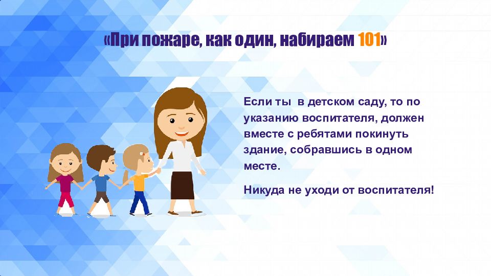 Если ты в детском саду, то по указанию воспитателя, должен вместе с ребятами покинуть здание, собравшись в одном месте. Никуда не уходи от воспитателя!