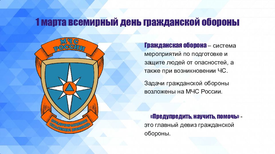 Гражданская оборона – система мероприятий по подготовке и защите людей от опасностей, а также при возникновении ЧС. Задачи гражданской обороны возложены на МЧС России. «Предупредить, научить, помочь » - это главный девиз гражданской обороны.