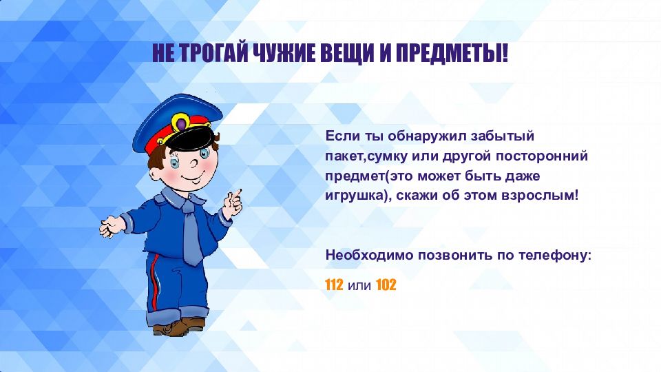 Если ты обнаружил забытый пакет,сумку или другой посторонний предмет(это может быть даже игрушка), скажи об этом взрослым! Необходимо позвонить по телефону: 112 или 102