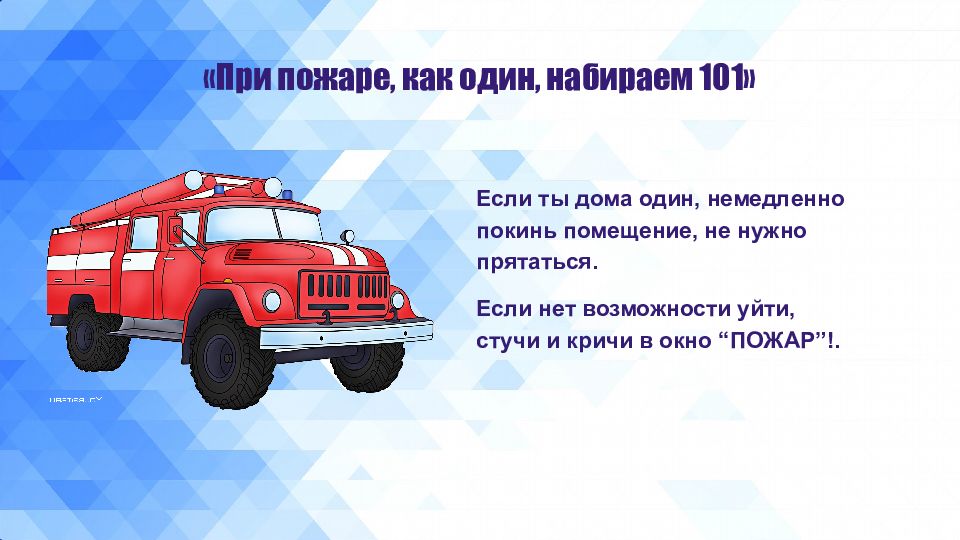 Если ты дома один, немедленно покинь помещение, не нужно прятаться. Если нет возможности уйти, стучи и кричи в окно “ПОЖАР”!.